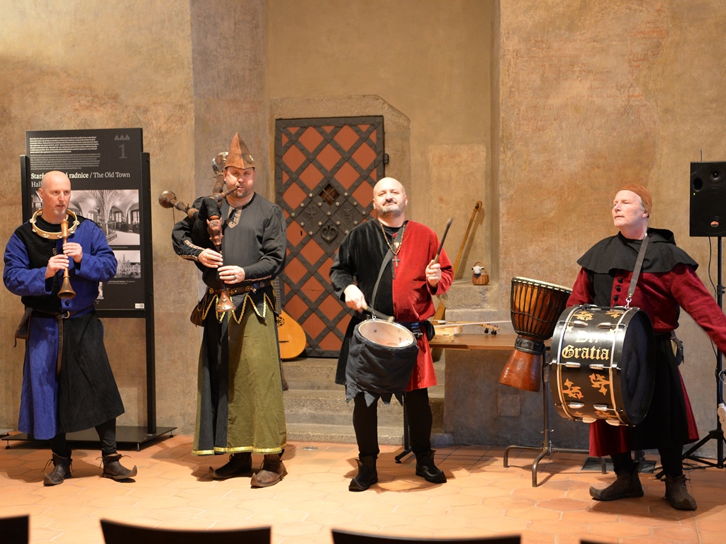V rámci programu zazněly dobové středověké melodie, které zahrál na repliku historických dud Miloslav Vaváček. Pan ministr spolu s dalšími hosty si mohli prohlédnout novou expozici s výkladem ředitele dr. Jakuba Smrčky, který je autorem scénáře výstavy spolu s dr. Zdeňkem Vybíralem.