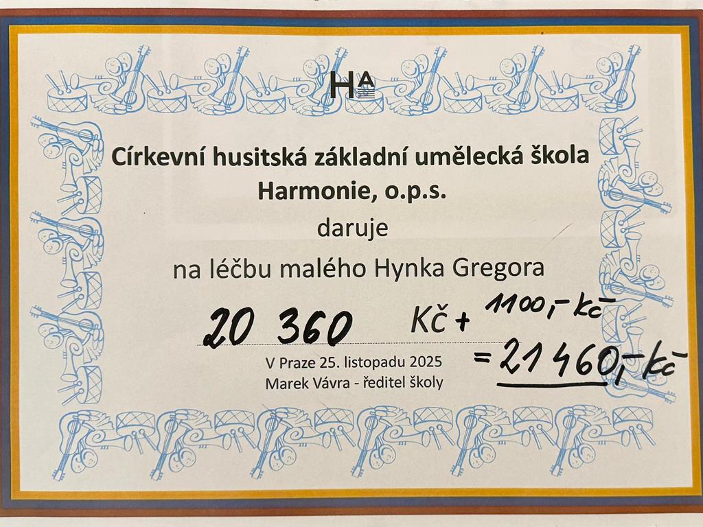 V úterý 25. 11. 2025 uspořádala Církevní husitská základní umělecká škola Harmonie v chrámu sv. Mikuláše na Staroměstském náměstí Benefiční koncert věnovaný podpoře tříletého Hynka, který trpí vzácným genetickým onemocněním.