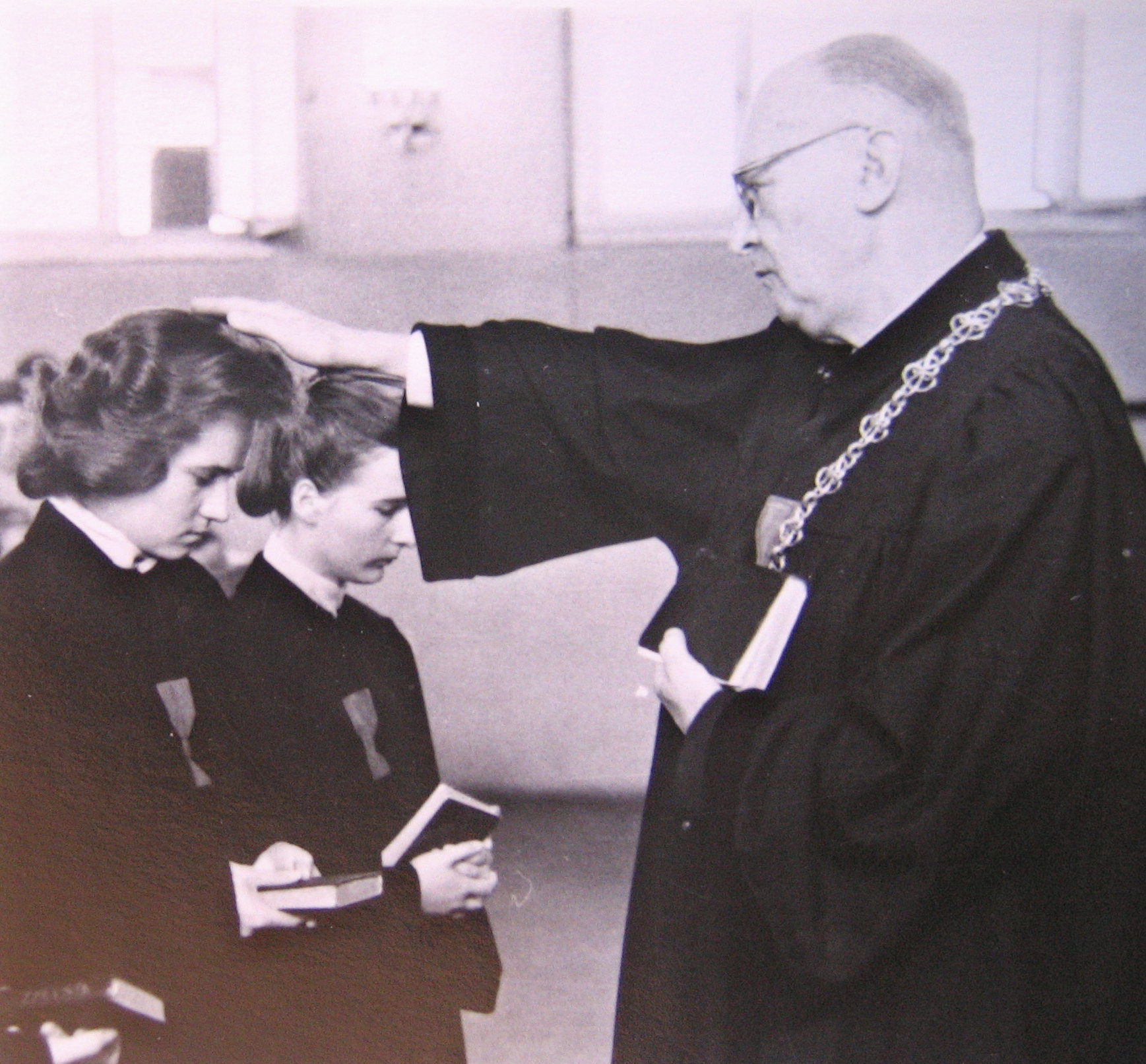 Foto č. 8: Kněžské svěcení v Husově sboru ve Vršovicích. František Kovář vkládá ruku na Martu Jurkovou, Jiřinka klečí vedle ní, 1961