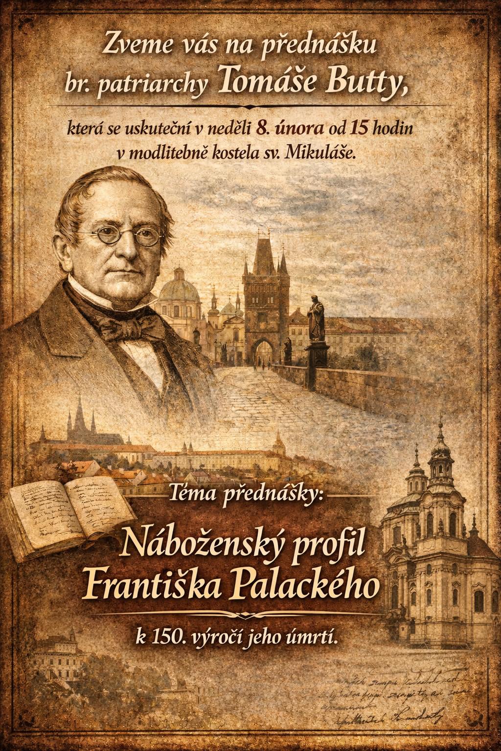 "Náboženský profil Františka Palackého" - přednáška br. patriarchy Tomáše Butty, se uskuteční v neděli 8. února od 15 hodin v modlitebně kostela sv. Mikuláš. Ke 150. výročí jeho úmrtí.