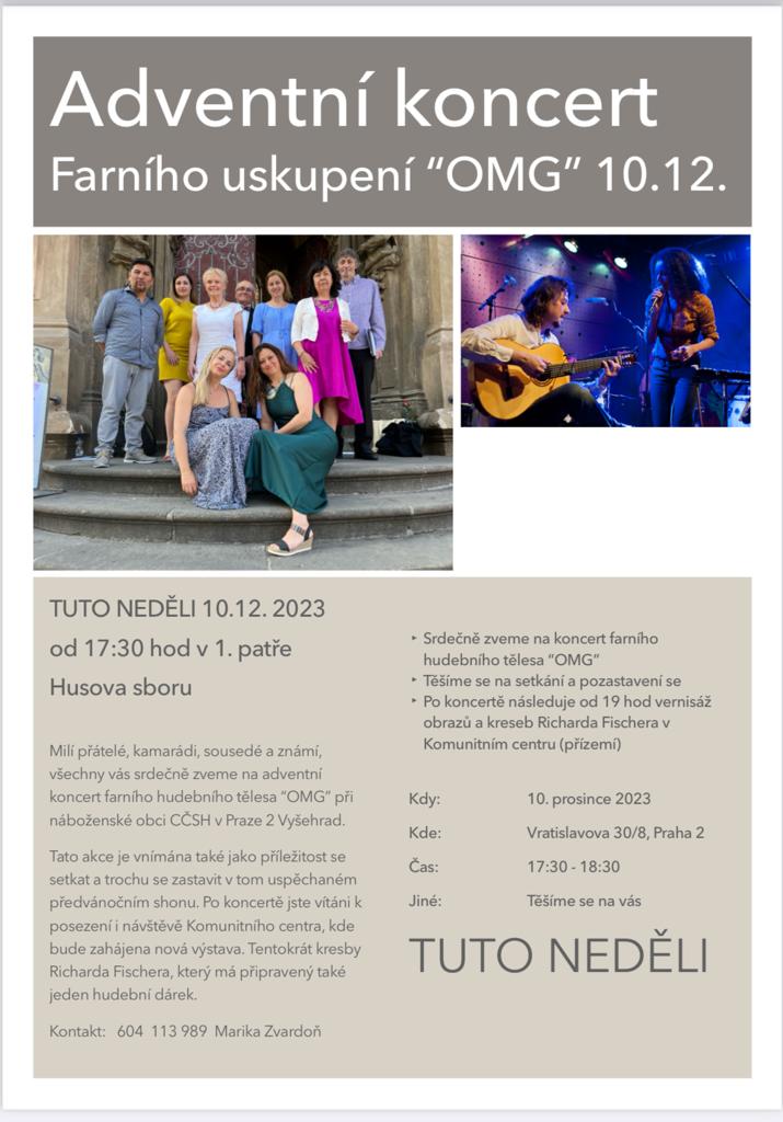 Přijměte pozvání na Adventní koncert farního hudebního tělesa “OMG” při náboženské obci CČSH v Praze 2 - Vyšehrad (Vratislavova 30/8). Tato akce je vnímána jako příležitost se setkat a trochu se zastavit v uspěchaném předvánočním shonu. Po koncertě jste vítáni k posezení i návštěvě Komunitního centra, kde bude zahájena výstava obrazů a kreseb Richarda Fischera (19.00), který má připravený také jeden hudební dárek.